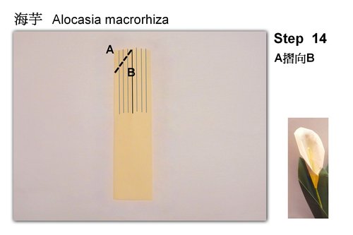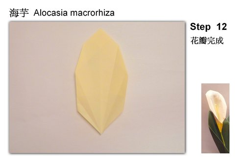試摺多次,決定海芋採兩張紙組合,卻也因此摺出了火鶴(一張紙)見下圖,